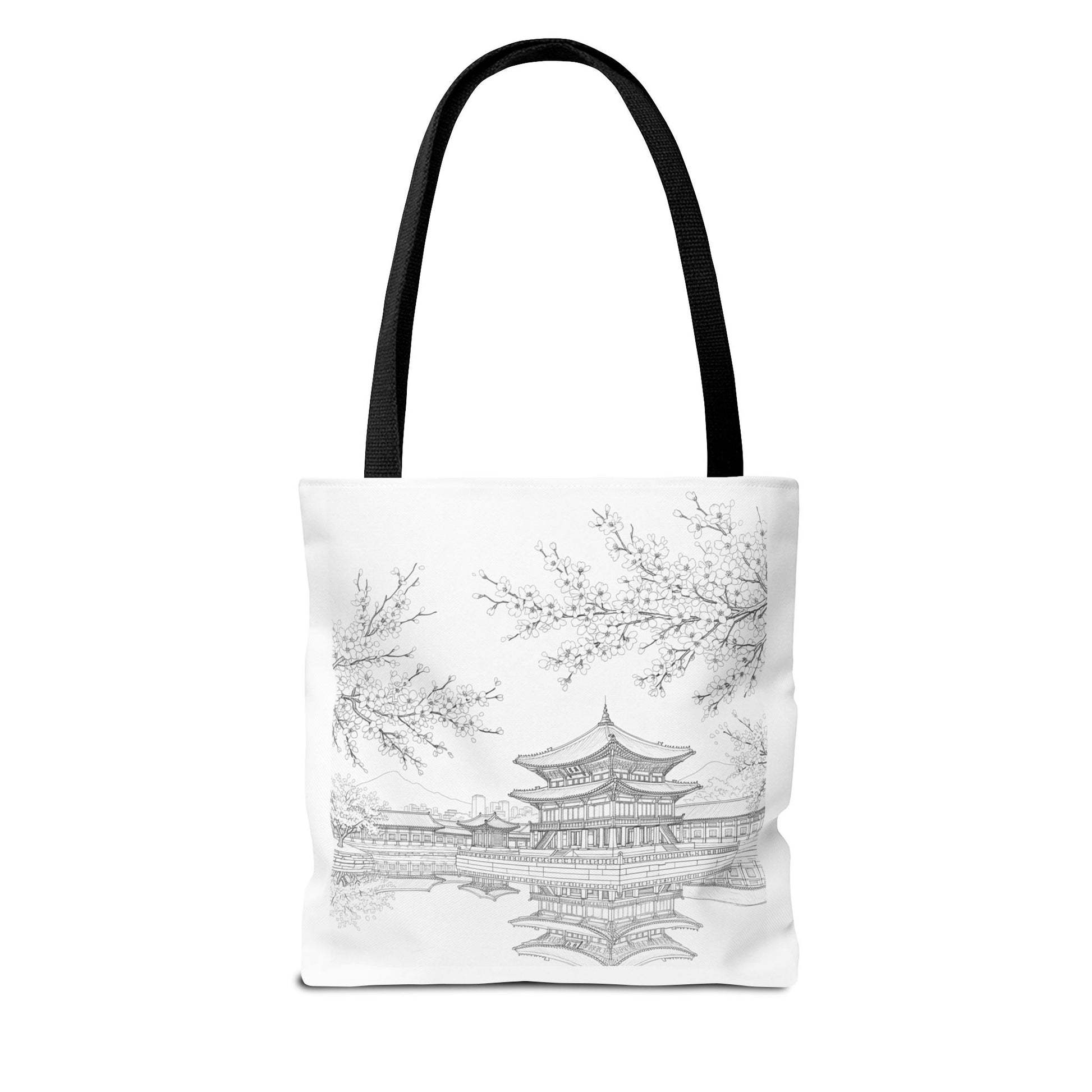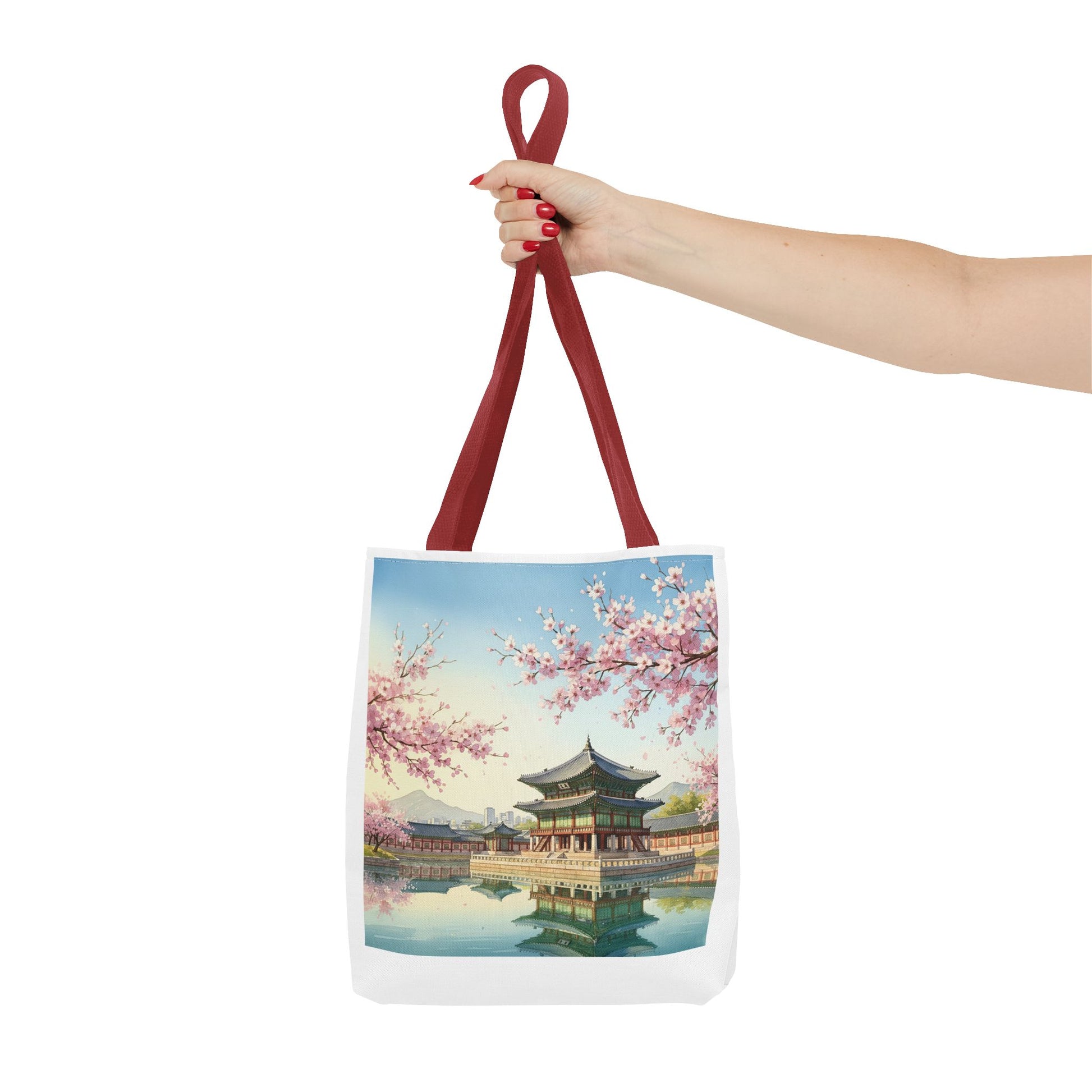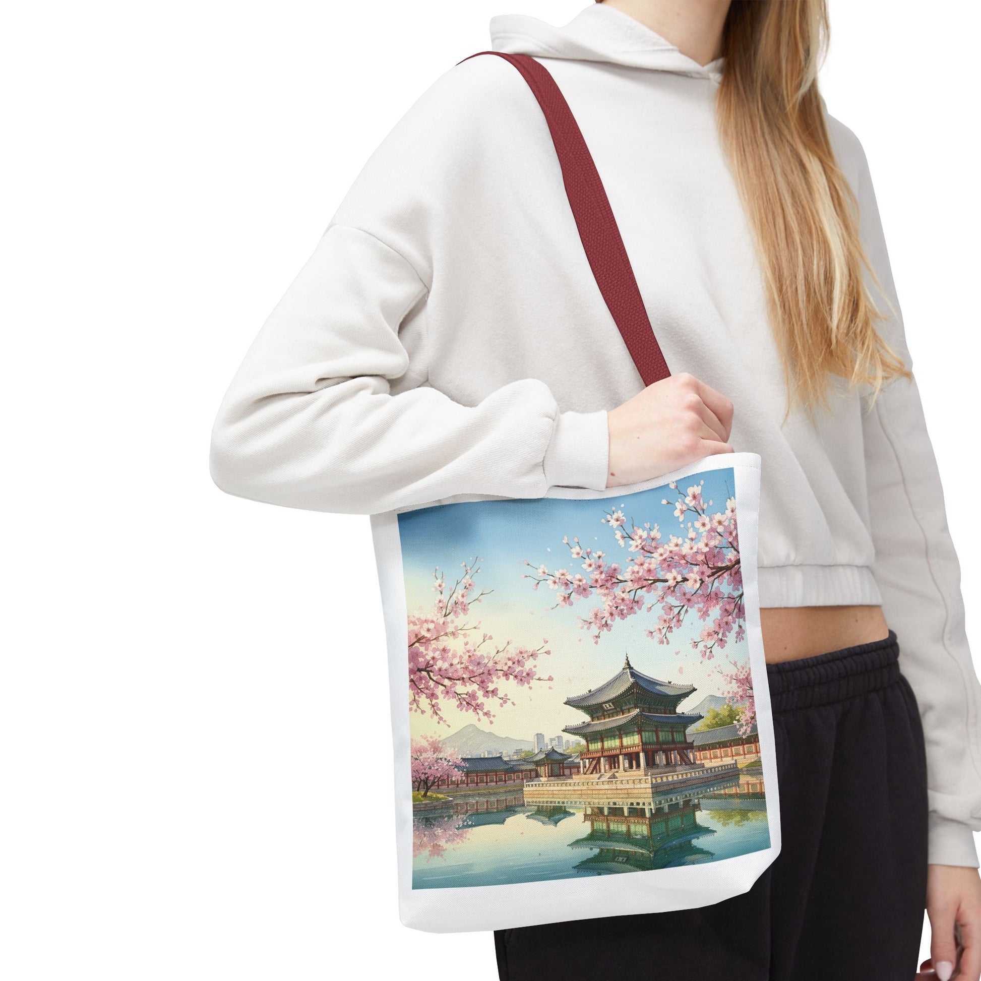 Seoul Spring Day Tote Bag | Cherry Blossom Palace Aesthetic | K-Drama Inspired Daily Shopper 2-Way Design (Color & Sketch